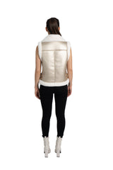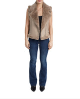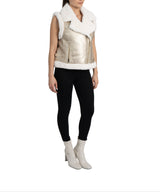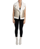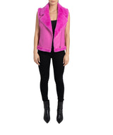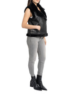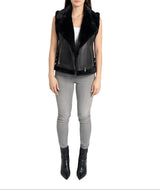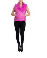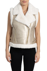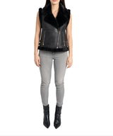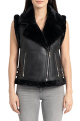 Faux fur lined moto vest, faux leather shell with faux fur lining, faux fur notched lapel collar, front zip closure, front zip pockets, belt detail on waist, faux fur trimmed armholes and waistline.
